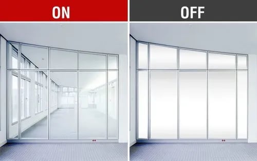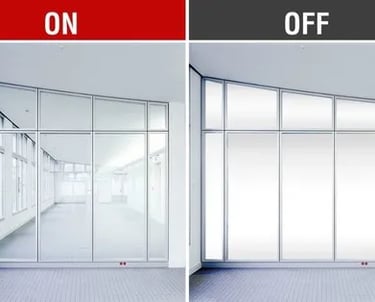 Smart film, also known as smart tint, instantly goes from clear to private when powered on and off.
